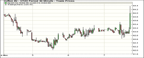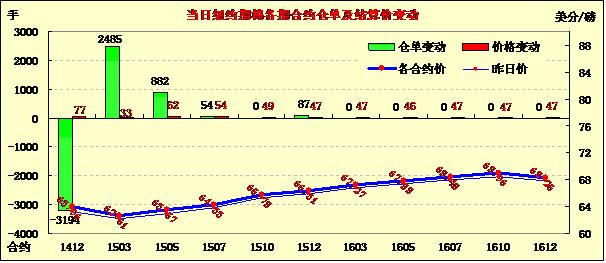 11月7日紐約期棉合約早盤下跌,盤尾小幅收漲,主力1412月合約結(jié)算價(jià)63.96美分/磅,漲77點(diǎn),遠(yuǎn)期1503月合約收于62.61美分/磅,漲33點(diǎn)。當(dāng)日開盤后銷售壓力顯現(xiàn),近期合約承壓,大部分合約呈下行趨勢(shì),盤終整體收漲。3月合約繼續(xù)在61.20美分/磅一線上小幅震蕩,12/3月價(jià)差擴(kuò)大。