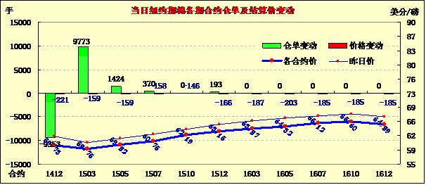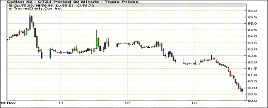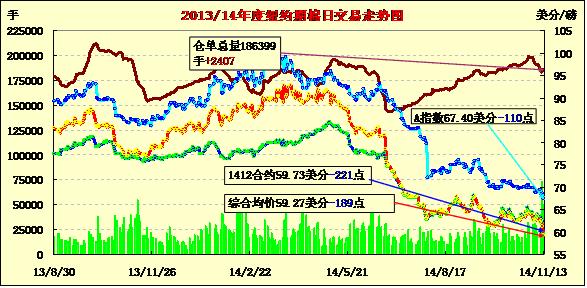 11月13日紐約期棉合約繼續(xù)下跌,大部分合約跌幅超過150點,部分合約超過200點,12月至5月合約均收于60美分/磅以下;近期1412月合約結(jié)算價59.73美分/磅,跌221點,主力1503月合約收于58.75美分/磅,跌159點。當日開盤后紐約期棉合約延續(xù)了前一日的跌勢,近期合約早盤下跌100點左右,主力合約震蕩幅度較小。3/12月合約價差98點。新年度印度將取代中國成為世界第一棉產(chǎn)量大國,日前印度棉協(xié)調(diào)增2014/15年度預(yù)計產(chǎn)量,USDA對印度供需沒做任何調(diào)整,供需壓力再度顯現(xiàn)。外部市場收跌。