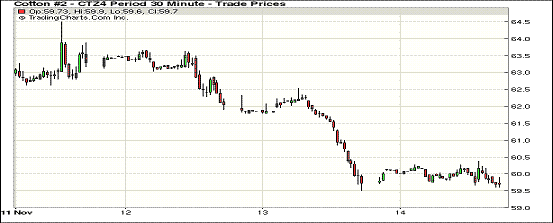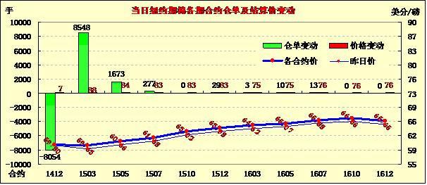 11月14日紐約期棉反彈,但近期合約和主力合約收盤價(jià)依然低于60美分/磅;近期1412月合約結(jié)算價(jià)59.80美分/磅,漲8點(diǎn),主力1503月合約收于59.63美分/磅,漲88點(diǎn)。當(dāng)日期棉結(jié)束跌勢,開盤后主力合約穩(wěn)步上行,最終全部收漲。但近期12月合約依然處于歷史低位,期棉整體上升空間有限。12/3月合約價(jià)差縮小至17點(diǎn)。新一期美棉出口數(shù)據(jù)利好,刺激紐約期棉反彈上漲,在本周最后一個(gè)交易日收漲,登記庫存突破2萬包。