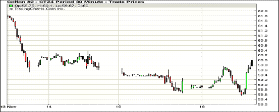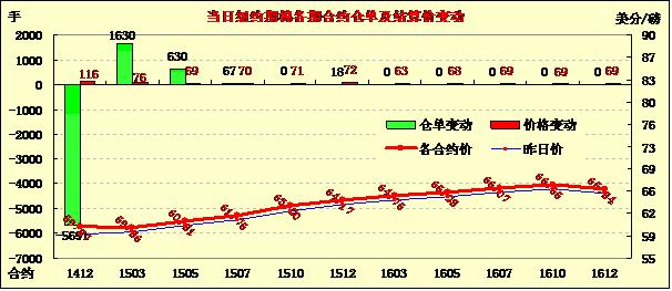 11月18日紐約期棉反彈上漲,收盤價為上周四來最高;近期1412月合約結算價59.97美分/磅,漲166點,主力1503月合約收于59.86美分/磅,漲76點。當日期棉開盤后走勢震蕩,午盤合約價小幅下跌,但最終收漲,阻力線為60美分/磅。12/3月合約價差9點。