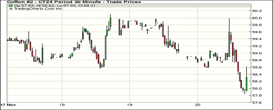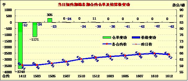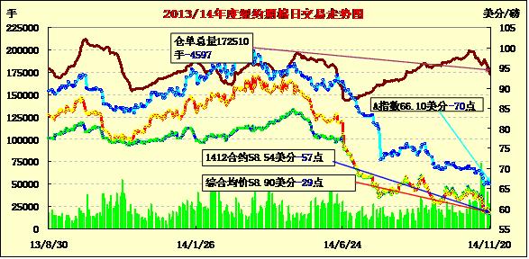11月20日紐約期棉下跌,近期合約再次創(chuàng)下新低,遠(yuǎn)月合約小幅下跌;近期1412月合約結(jié)算價58.54美分/磅,跌57點,主力1503月合約收于58.86美分/磅,跌24點。當(dāng)日主力合約低開,之后震蕩上行,盤尾買盤壓力重現(xiàn),期棉反彈失敗,成交量減少。12/3月合約價差18點。