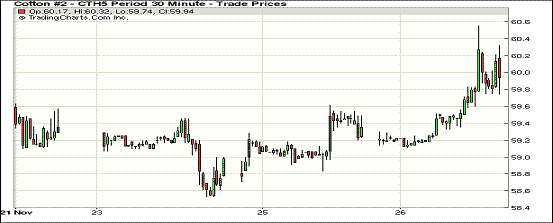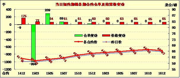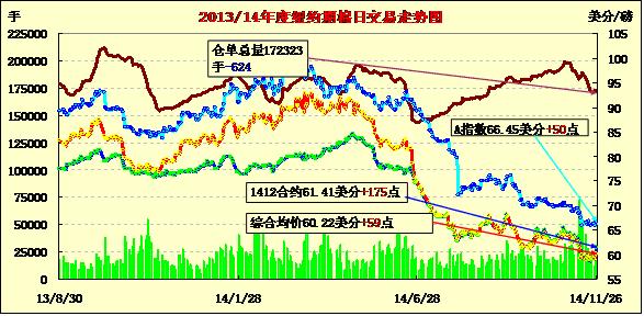 11月26日紐約期棉連續(xù)第二日上漲,合約價重回60美分,近月合約漲幅較大;1412月合約結(jié)算價61.41美分/磅,漲175點,主力1503月合約收于60.03美分/磅,漲72點。當日開盤后主力合約震蕩上行,午后沖高,最高價60.55美分,最終收復(fù)60美分一線,漲幅1.21%。12/3月合約價差擴大,為138點。周二和周三全球股市上漲刺激紐約期棉反彈,但在供應(yīng)和庫存壓力下,棉價長期內(nèi)難有作為。