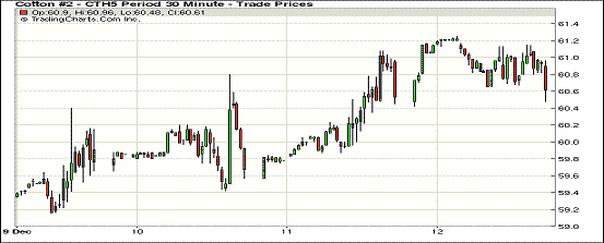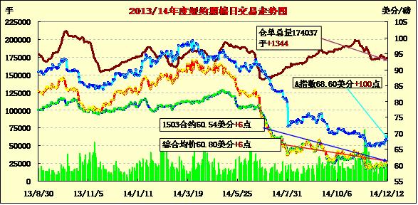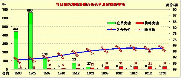 本周最后一個(gè)交易日,紐約期棉繼續(xù)小幅上漲;主力1403月合約結(jié)算價(jià)60.54美分/磅,漲6點(diǎn);1503月合約收于61.07美分/磅,漲5點(diǎn)。當(dāng)日期棉開(kāi)盤(pán)后繼續(xù)窄幅震蕩,主力3月合約最高漲至61.25美分/磅,午盤(pán)過(guò)后投資者入場(chǎng)對(duì)棉價(jià)形成支撐,盤(pán)終遠(yuǎn)近合約收漲6-12點(diǎn)不等,主力合約周漲幅123點(diǎn);下周一(15日)為近期12月合約第一通知日。據(jù)USDA,2014/15年度全球棉花貿(mào)易預(yù)計(jì)連續(xù)第二年下滑,同比減幅為16%。