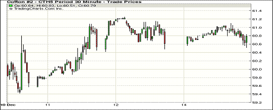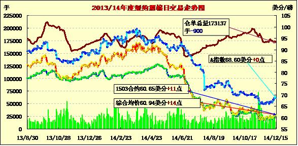 12月15日,棉花市場(chǎng)消息面有限,紐約期棉先漲后跌;主力3月合約結(jié)算價(jià)60.65美分/磅,漲11點(diǎn);1505月合約收于61.19美分/磅,漲12點(diǎn)。當(dāng)日期棉開盤后普遍上漲,午盤過后主力合約跌回上周五點(diǎn)位,盤終近期合約小幅上漲,遠(yuǎn)期1512月-1612月合約普遍下跌;市場(chǎng)成交較前一日明顯減少。下周多國(guó)進(jìn)入圣誕節(jié)和新年假期,節(jié)前紡企采購(gòu)意愿降低,市場(chǎng)成交量將有所下滑。