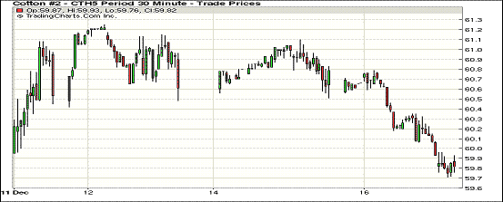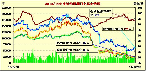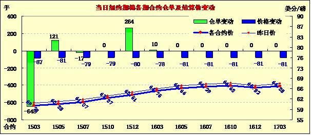 在連續(xù)三個交易日上漲后,16日紐約期棉止?jié)q回落,跌幅普遍不及百點;主力1503月合約結(jié)算價59.78美分/磅,跌87點;1505月合約收于60.38美分/磅,跌81點。當日期棉開盤后繼續(xù)圍繞60美分上下震蕩調(diào)整,主力3月合約盤終收于59.78美分/磅,為12月11日以來低點,市場成交量上升;外部商品市場玉米和大豆收跌。