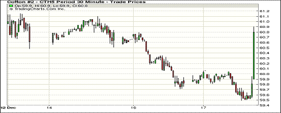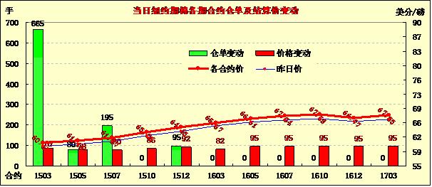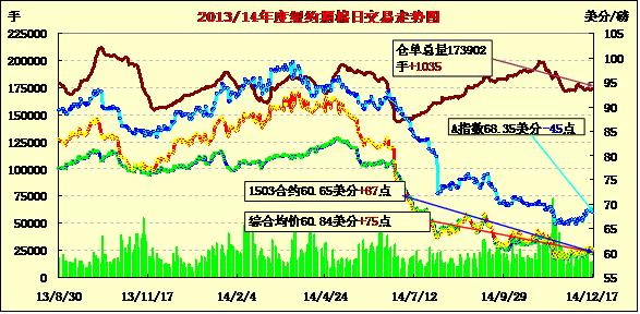 受小麥等外部商品市場期貨上漲拉動,17日紐約期棉再度止跌反彈;主力1503月合約結(jié)算價60.65美分/磅,漲87點;1505月合約收于61.16美分/磅,漲78點。當(dāng)日期棉開盤后繼續(xù)窄幅震蕩,盤終前市場買盤拉動棉價持續(xù)上漲,主力合約最高突破并收于61美分/磅以上;外部市場商品期貨、美股和原油普遍上漲,市場成交量低位運(yùn)行。國際油價連續(xù)下挫打壓人造纖維價格,棉花產(chǎn)品雖更具競爭能力,但植棉面積和產(chǎn)量不斷上升以及高期末庫存預(yù)期,仍對國際棉價是個巨大壓力。