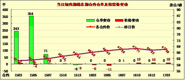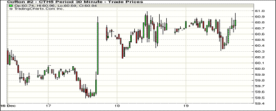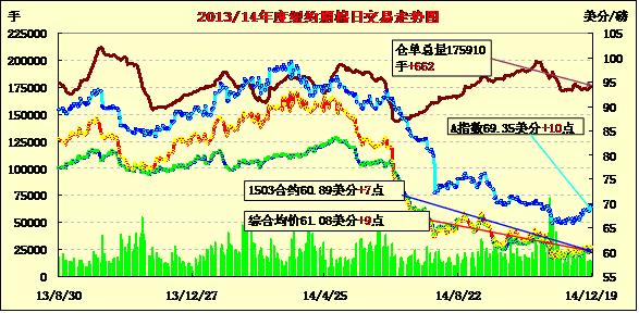 12月19日,紐約期棉繼續(xù)盤中調(diào)整,各合約漲跌互現(xiàn);主力1503月合約結(jié)算價60.89美分/磅,漲7點(diǎn);1505月合約收于61.35美分/磅,跌4點(diǎn)。當(dāng)日期棉開盤后震蕩調(diào)整,主力3月合約最高漲至60.96美分/磅,盤終收于61美分以下,連續(xù)第三個交易日收漲,5月合約微幅下跌;外部谷物市場漲跌不一。
