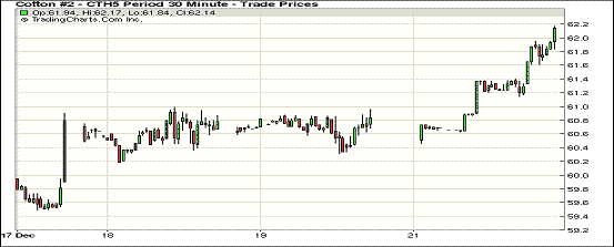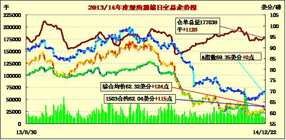 12月22日,紐約期棉普遍上漲,近期合約均收于62美分以上;主力3月合約結(jié)算價(jià)62.04美分/磅,漲115點(diǎn);1505月合約收于62.49美分/磅,漲114點(diǎn)。當(dāng)日期棉高開(kāi)高走,受市場(chǎng)投機(jī)性買(mǎi)盤(pán)等因素支持,主力3月合約和5月合約均大幅上漲,主力合約收于11月7日以來(lái)高點(diǎn),3/5月價(jià)差45點(diǎn);外部谷物市場(chǎng)小麥和油籽上漲。