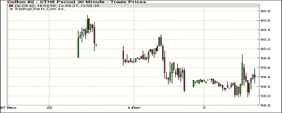 12月2日,紐約期棉各合約普遍反彈,近期12月合約結(jié)算價60.75美分/磅,漲57點;主力3月合約收于59.38美分/磅,漲20點。當(dāng)日期棉開盤后在小幅上漲并在午盤后漲至當(dāng)日高位,主力3月合約盤終收漲但仍未突破60美分,近期12月合約連續(xù)兩周在58.5-60.7美分/磅之間震蕩,當(dāng)日外部商品市場普遍收跌;12/3月價差繼續(xù)拉大至137點。棉花市場消息面有限,期棉繼續(xù)窄幅震蕩調(diào)整;受國際棉價下跌和國內(nèi)氣候干燥影響,澳洲將本年度棉產(chǎn)量調(diào)低至五年低位。
