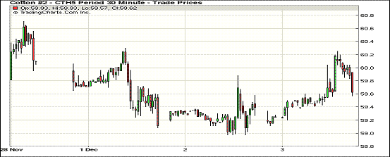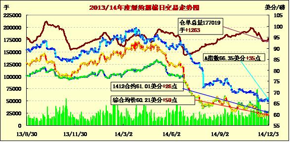 12月3日,紐約期棉延續(xù)前一日走勢(shì)繼續(xù)收漲,近期12月合約結(jié)算價(jià)61.01美分/磅,漲26點(diǎn);主力3月合約收于59.64美分/磅,漲26點(diǎn)。當(dāng)日期棉開盤后連續(xù)第二個(gè)交易日低開高走,市場(chǎng)成交量有限,棉價(jià)在午盤后漲至高位,主力合約仍未突破60美分點(diǎn)位;外部市場(chǎng)玉米大豆收跌,美元指數(shù)上漲。
