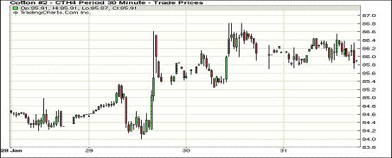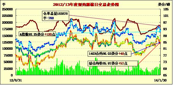 1月31日,期棉遠近合約均普遍下跌;主力3月合約結算價85.83美分/磅,跌20點;1405月合約收于86.33美分/磅,跌54點;1407月合約收于85.94美分/磅,跌70點。期棉開盤后窄幅震蕩,主力3月合約小幅上漲,震蕩區(qū)間85.7-86.55美分/磅,成交量相比前一日下降。