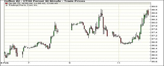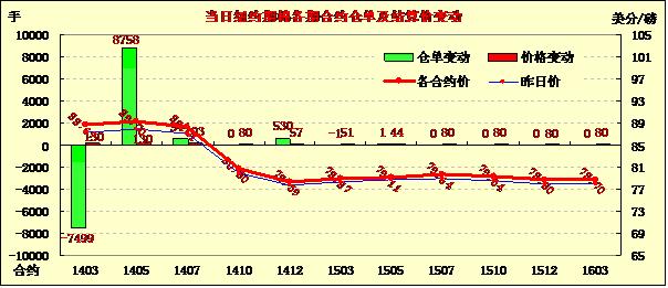 市場(chǎng)當(dāng)日平開高走,近期3月合約早盤平穩(wěn)在87美分/磅上下;午盤后受美棉供應(yīng)緊張憂慮支持走高,盤終收于2013年8月19日以來最高值。1405月合約于2012年4月份以來首次收于89美分/磅之上,該合約取代1403月成為盤面上持倉(cāng)量最大的合約。市場(chǎng)成交持續(xù)活躍。