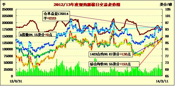 2月11日,市場(chǎng)預(yù)期美棉供應(yīng)緊張抵消了USDA月報(bào)不及預(yù)期的因素,紐約期棉近期合約大幅上揚(yáng),1403月合約結(jié)算價(jià)88.67美分/磅,漲130點(diǎn);1405月合約結(jié)算價(jià)89.20美分/磅,漲130點(diǎn);1407月合約結(jié)算價(jià)88.21美分/磅,漲103點(diǎn);遠(yuǎn)期合約漲幅在44-80點(diǎn)之間。