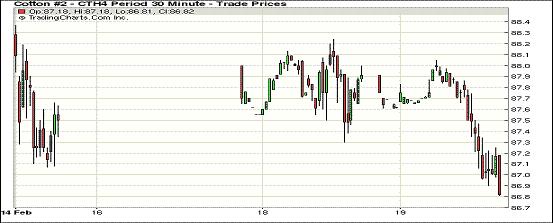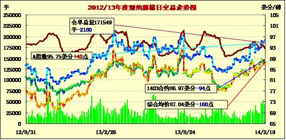 2月19日期棉上漲動(dòng)力不足,遠(yuǎn)近合約均大幅下跌。主力3月合約收于86.97美分/磅,跌94點(diǎn);5月合約結(jié)算價(jià)87.91美分/磅,跌157點(diǎn);1407月合約收于87.83美分/磅,跌117點(diǎn)。主力5月合約開盤后短暫上漲,后由于缺乏支撐一路下跌,盤終跌幅157點(diǎn),該合約近期創(chuàng)2012年4月份以來高位,后連續(xù)6個(gè)交易日下跌。