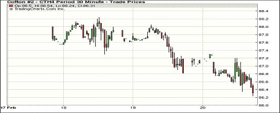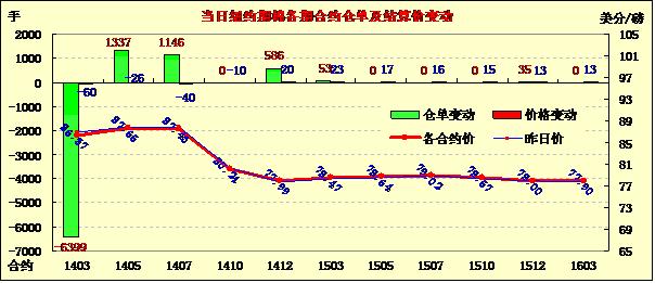 2月20日,受USDA預測2014/15年度美棉面積將增長10.5%影響,紐約期棉近期合約繼續(xù)收跌,1403月合約結算價86.37美分/磅,跌60點;主力1405月合約結算價87.65美分/磅,跌26點;1407月合約結算價87.43美分/磅,跌40點。當日主力5月合約平穩(wěn)開盤后開始下行,上半場跌破前一日低點87.81美分,至當日最低點87.46美分/磅;下半場雖兩次短暫重返88美分之上,但終未能守住漲勢,盤終中幅收跌。7/12月合約價差縮小至944點,此前一日為1004點。當日玉米及大豆市場走高,小麥及原油市場收緊。美國農業(yè)部首席經濟學家在年度展望論壇上預測,2014/15年度美棉種植面積為1150萬英畝,同比增10.5%;此前,NCC的預測為1126萬英畝,同比增8.2%。