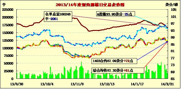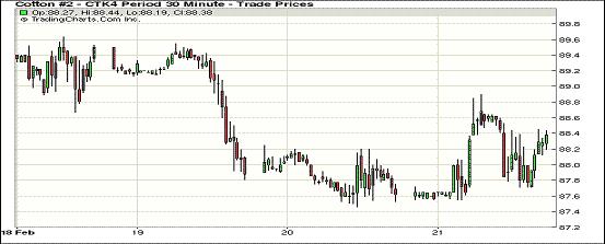 2月21日,紐約期棉普遍上漲,3月合約結(jié)算價87.09美分/磅,漲72點;主力5月合約結(jié)算價88.35美分/磅,漲70點;7月合約收于88.23美分/磅,漲80點。當日主力5月合約早盤上漲,后受賣盤打壓回吐部分所得,震蕩區(qū)間86.29-88.05美分/磅,盤終上漲72點,成交量較前一日基本持平。