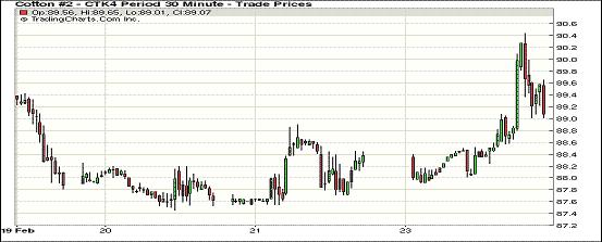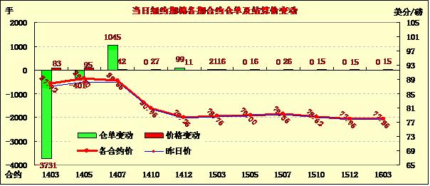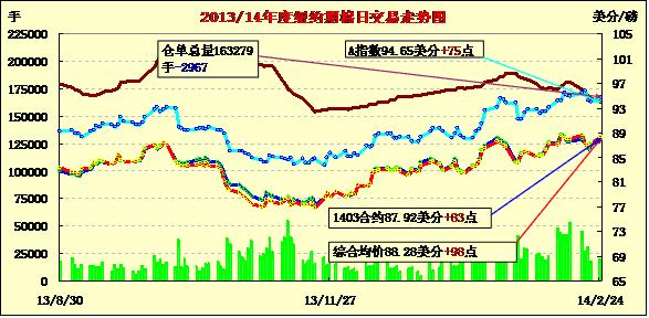 2月24日,紐約期棉受投機(jī)買盤支持延續(xù)上周五漲勢(shì)繼續(xù)走高,1403月合約結(jié)算價(jià)87.92美分/磅,漲83點(diǎn);主力1405月合約結(jié)算價(jià)89.30美分/磅,漲95點(diǎn);1407月合約結(jié)算價(jià)88.65美分/磅,漲42點(diǎn)。當(dāng)日市場(chǎng)平穩(wěn)開盤,主力5月合約上半場(chǎng)在88-88.5美分/磅區(qū)間震蕩;因市場(chǎng)炒作美棉交割資源緊張,投機(jī)買盤在午盤后入市促期棉一路上揚(yáng),該合約突破90美分阻力位,當(dāng)日最高至90.44美分/磅;交易尾段基本在89-89.5美分之間運(yùn)行,此交易區(qū)間為2012年2月份以后最高值;該合約盤終漲幅近百點(diǎn)。分析指出,因近月合約缺乏實(shí)貨交割,表明棉花供應(yīng)狀況比想像的更為緊張;同時(shí)美元走低也對(duì)期棉市場(chǎng)提供支持。