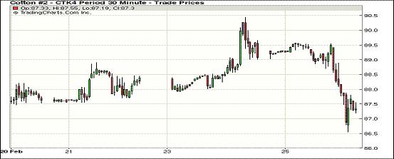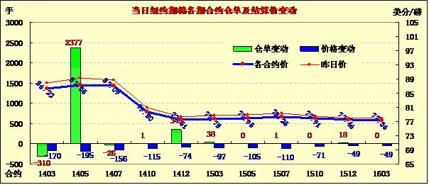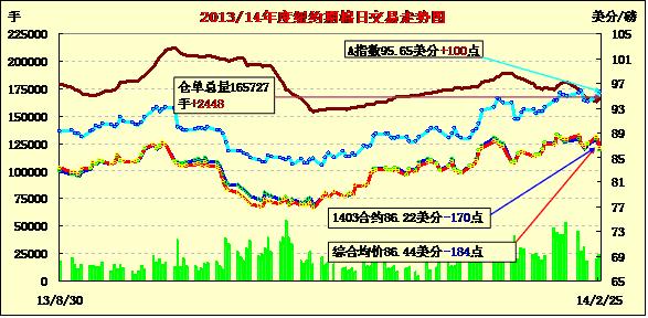 2月25日,多頭平倉打壓紐約期棉大幅下跌,近月合約跌幅均在100點以上。1403月合約結算價86.22美分/磅,跌170點;主力1405月合約結算價87.35美分/磅,跌195點;1407月合約結算價87.09美分/磅,跌156點。當日市場平穩(wěn)開盤,主力5月合約上半場在89-89.5美分/磅高位運行;午盤后多頭平倉打壓市場下行,該合約一路下跌,當日最低跌至86.55美分/磅;尾盤時回補部分跌幅,盤終該合約較前一日跌幅達3%,創(chuàng)一個月來最大單日跌幅。