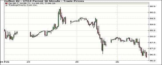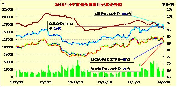 2月26日,投機(jī)賣盤打壓期棉連續(xù)第二個(gè)交易日收低,1403月合約結(jié)算價(jià)85.37美分/磅,跌85點(diǎn);主力1405月合約結(jié)算價(jià)86.37美分/磅,跌98點(diǎn);1407月合約結(jié)算價(jià)85.95美分/磅,跌114點(diǎn)。市場當(dāng)日高開低走,主力5月合約上半場穩(wěn)定在87.5-88美分/磅;午盤后投機(jī)賣盤涌入打壓市場下跌,該合約盤終收于2月5日以來最低值,過去兩個(gè)工作日跌了近3個(gè)美分,自本周一的高點(diǎn)跌幅約4.5%。分析指出,此前因預(yù)計(jì)棉花供應(yīng)緊張,投資人長時(shí)間建立了大量多頭頭寸,25日市場跌破趨勢線,引發(fā)大量止損賣單,同時(shí)投機(jī)賣盤進(jìn)一步出脫倉位。市場關(guān)注將于今晚公布的新一期美棉出口周報(bào)。