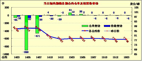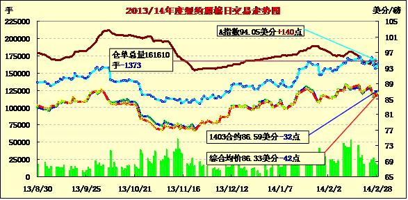 2月28日,因投機(jī)者結(jié)清多頭頭寸,紐約期棉未能延續(xù)前一日漲勢(shì)多數(shù)合約回落,近期1403月合約收于86.59美分/磅,跌32點(diǎn);1405月合約結(jié)算價(jià)87.14美分/磅,跌67點(diǎn);1407月合約結(jié)算價(jià)86.89美分/磅,跌38點(diǎn)。市場(chǎng)交易量較前幾日明顯下降。當(dāng)日主力月合約開盤較為平穩(wěn),因擔(dān)心中國(guó)需求回落,期棉承壓下滑,該合約跌至當(dāng)日最低點(diǎn)86.36美分/磅,盤終有所反彈回補(bǔ)部分跌幅,盤終連續(xù)第二周收跌。本周1403月合約累計(jì)跌50點(diǎn),1405月合約累計(jì)跌121點(diǎn),1407月合約跌134點(diǎn),1412月跌32點(diǎn)。