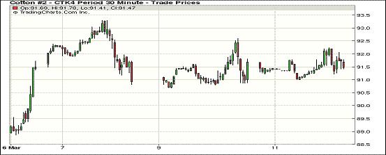 3月11日棉花市場消息量有限,期棉延續(xù)前一日走勢先漲后跌,盤終小幅上漲。主力5月合約收于91.65美分/磅,漲9點(diǎn);7月合約結(jié)算價90.08美分/磅,跌38點(diǎn);1410月合約收于81.98美分/磅,跌14點(diǎn)。當(dāng)日期棉多在前一日區(qū)間動蕩,盤終主力5月合約微幅上漲,7月及10月合約下跌,市場成交量進(jìn)一步減少。據(jù)美國農(nóng)業(yè)部消息,美國堪薩斯州、俄克拉荷馬州及亞利桑那州部分軋花廠持續(xù)開工,加州SJV流域旱情仍嚴(yán)重。