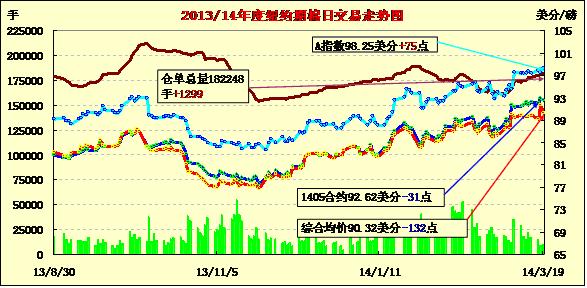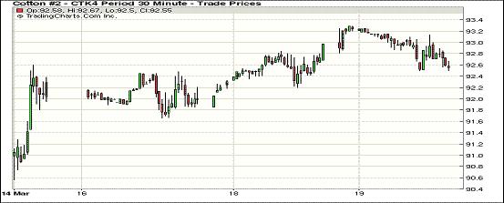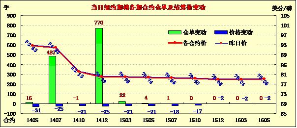 3月19日,紐約期棉未能延續(xù)前一日漲勢(shì),遠(yuǎn)近合約均普遍下跌;主力5月合約結(jié)算價(jià)92.62美分/磅,跌31點(diǎn);1407月合約收于91.83美分/磅,跌25點(diǎn);1410月合約收于82.12美分/磅,跌21點(diǎn)。當(dāng)日期棉開盤后普遍震蕩,盤終中幅下跌,主力5月合約持續(xù)下跌,震蕩區(qū)間92.48-93.29美分/磅;美棉銷售情況將決定棉價(jià)下一步走勢(shì);外部商品市場(chǎng)小麥和大豆上漲,美股下跌。分析指出,19日期棉市場(chǎng)消息面平平,期棉自上周大幅上漲后缺乏下一步走向,關(guān)注今晚發(fā)布的美棉出口周報(bào)。