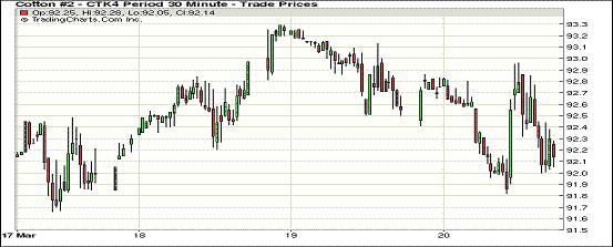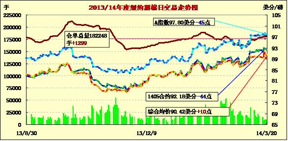 3月20日,紐約期棉延續(xù)前一日走勢(shì)繼續(xù)下跌。主力5月合約收于92.18美分/磅,跌44點(diǎn);7月合約結(jié)算價(jià)91.77美分/磅,跌6點(diǎn);1410月合約收于82.08美分/磅,跌4點(diǎn)。當(dāng)日期棉開盤后普遍上漲,后持續(xù)震蕩,盤終近期合約收跌,主力合約連續(xù)四個(gè)交易日收于92美分以上。3.7-3.13一周美國凈簽約出口本年度陸地棉11521噸,裝運(yùn)74616噸;中國凈簽約本年度陸地棉2064噸,裝運(yùn)19527噸。