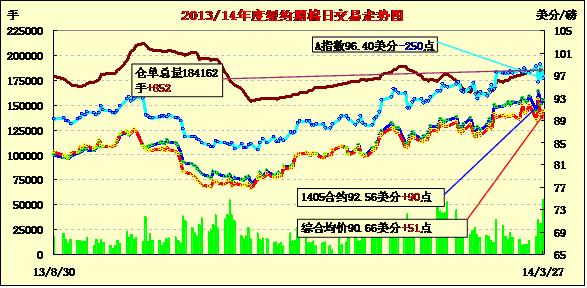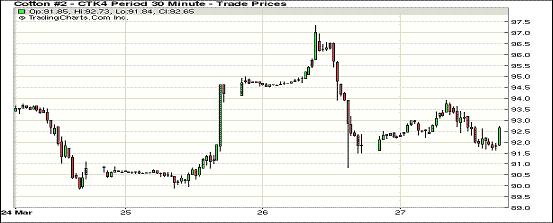 3月27日,紐約期棉近期合約收漲,遠期合約略有下跌;主力5月合約結(jié)算價92.56美分/磅,漲90點;7月合約結(jié)算價92.37美分/磅,漲101點;10月合約收于81.49美分/磅,漲12點。經(jīng)過連續(xù)兩日寬幅震蕩后,27日棉價震蕩區(qū)間縮小,當日早盤略有下跌,主力5月合約受市場買盤支撐上漲近百點;市場成交較前一日的六周高值(56095手)大幅下降,1412月新花在80美分/磅以下徘徊。受各國政策消息影響,本周棉價大起大落;上周美國凈簽約出口本年度陸地棉15037噸,較前一周增31%,較近四周平均值減11%;裝運58763噸,較前一周減21%,較近四周平均值減16%。