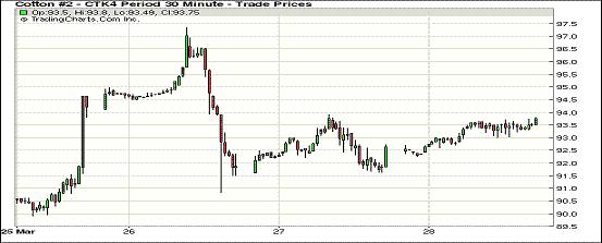 3月28日,紐約期棉繼續(xù)大幅上漲;主力5月合約結算價93.47美分/磅,漲118點;7月合約結算價93.61美分/磅,漲124點;10月合約收于82美分/磅,漲51點。期棉當日開盤后普遍上漲,主力5月合約區(qū)間92.25-93.8美分/磅,盤終近期合約收漲超百點,7/12月合約價差繼續(xù)放大至1368點;市場成交量繼續(xù)縮小。據(jù)統(tǒng)計,主力合約本周漲勢強勁,累計上漲311點。