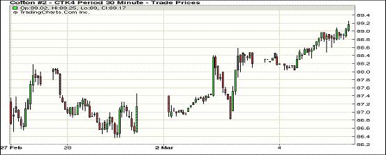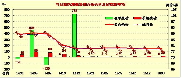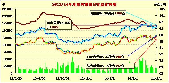 3月4日,受投機(jī)性買盤及外部市場(chǎng)和美股上漲帶動(dòng),紐約期棉繼續(xù)上漲。主力3月合約收于88.32美分/磅,漲46點(diǎn);5月合約結(jié)算價(jià)89.22美分/磅,漲89點(diǎn);1407月合約收于88.47美分/磅,漲80點(diǎn)。主力5月合約早盤漲幅一般,在89美分/磅以下震蕩向上,盤終前突破89美分收漲89點(diǎn);市場(chǎng)成交量一般。市場(chǎng)繼續(xù)等待中國(guó)方面發(fā)布棉花新政,導(dǎo)致棉花消息有限,抑制市場(chǎng)成交,美國(guó)道瓊斯指數(shù)大漲抵消前一日烏克蘭國(guó)內(nèi)危機(jī)負(fù)面消息影響;ICAC將2014/15年度全球期末庫(kù)存由此前預(yù)計(jì)的2081萬(wàn)噸調(diào)增至2084萬(wàn)噸。