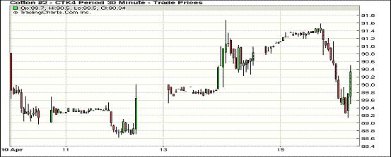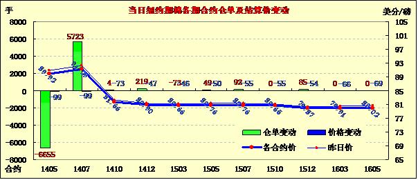 4月15日,紐約期棉未能延續(xù)前一日漲勢普遍下跌。5月合約收于89.92美分/磅,跌99點;7月合約結(jié)算價91.29美分/磅,跌99點;1410月合約收于81.66美分/磅,跌73點。受投資者獲利平倉影響,期棉當(dāng)日開盤后整體轉(zhuǎn)弱,主力7月合約震蕩區(qū)間90.51-92.69美分/磅,盤終遠(yuǎn)近合約整體下跌;外部商品市場收漲。
