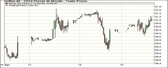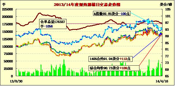 4月16日,紐約期棉大幅收漲,近期合約漲幅明顯;5月合約結(jié)算價(jià)91.04美分/磅,漲112點(diǎn);主力07月合約收于92.57美分/磅,漲128點(diǎn);1410月合約收于82.23美分/磅,漲57點(diǎn)。當(dāng)日期棉開盤后持續(xù)上漲,主力合約漲幅明顯,12月合約漲至2013年6月17日以來高點(diǎn)(81.73美分/磅),盤終回吐部分所得;市場(chǎng)成交量相比前一日放大,小麥等外部谷物市場(chǎng)下跌。美國德州西部棉區(qū)持續(xù)干燥,預(yù)計(jì)本周末有陣雨,關(guān)注今晚發(fā)布的美棉出口周報(bào)。