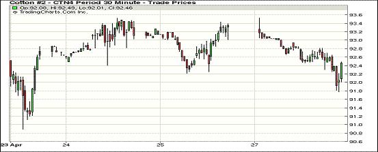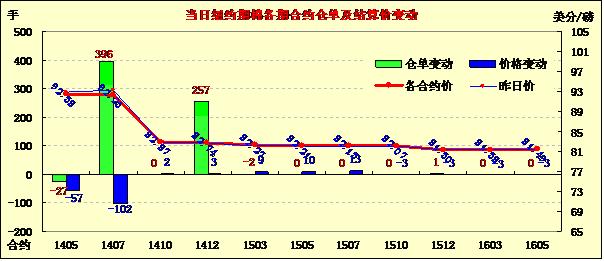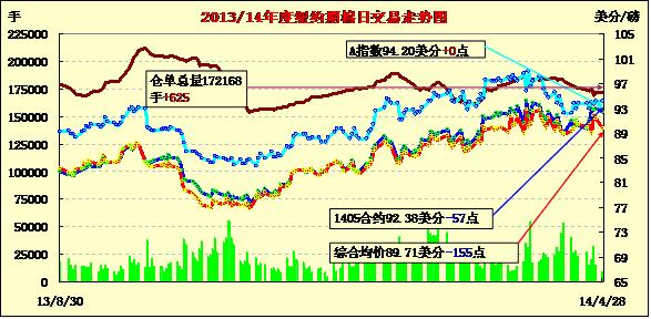 4月28日,紐約期棉漲跌互現(xiàn),近期5月合約結(jié)算價92.38美分/磅,跌57點(diǎn);主力1407月合約結(jié)算價92.23美分/磅,跌102點(diǎn);1412月合約收于82.74美分/磅,漲3點(diǎn)。當(dāng)日期棉市場平開低走,主力7月合約早盤在92.8美分/磅上下波動,午盤時分震蕩區(qū)間下滑至92.6美分/磅,尾盤獲利平倉盤打壓市場繼續(xù)下跌,該合約跌至當(dāng)日最低點(diǎn)91.78美分,盤終雖略有反彈但仍跌幅過百。該合約目前受阻于93.50美分/磅壓力位,7/12月合約價差收窄至949點(diǎn),上周五為1054點(diǎn)。