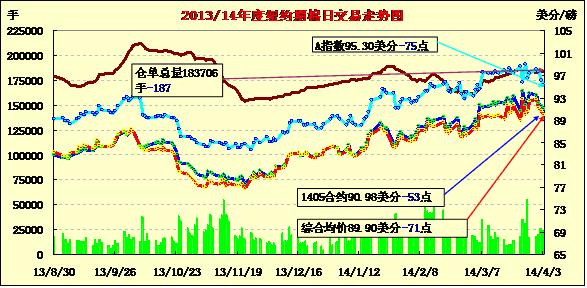 4月3日,中國拋儲力度加大使市場擔心中國需求將持續(xù)下降,同時美棉供應(yīng)增加憂慮繼續(xù)打壓棉價,紐約期棉連續(xù)第四個交易日收跌,主力1405月合約結(jié)算價90.98美分/磅,跌53點;1407月合約結(jié)算價91.25美分/磅,跌72點。當日期棉當日平穩(wěn)開盤,主力合約早盤在91.4美分/磅上下波動,下半場美棉銷售不佳打壓市場下行,此外中國需求及美棉供應(yīng)憂慮使市場保持弱態(tài),主力合約盤終收于91美分/磅之下。5/7月合約價差27點,較前一日縮小19點;7/12月合約價差在1181點,較前一日走窄45點。據(jù)美國農(nóng)業(yè)部(USDA),3.21-3.27一周美國凈簽約出口本年度陸地棉9684噸(較前一周減36%,較近四周平均值減49%),裝運55951噸(較前一周減5%,較近四周平均值減19%)。