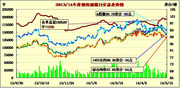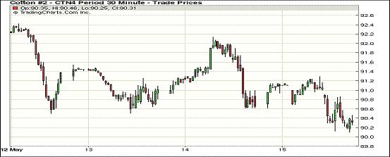 5月15日受美棉出口周報(bào)利空及外圍商品市場(chǎng)整體下跌影響,紐約期棉市場(chǎng)連續(xù)收跌,近期7月合約結(jié)算價(jià)90.36美分,跌34點(diǎn),1412月合約結(jié)算價(jià)82.62美分,跌26點(diǎn)。當(dāng)日7月合約早盤穩(wěn)定于91美分一線,盤中在90-91美分之間運(yùn)行。交易后期因美棉出口周報(bào)顯示前一周美棉出口狀況不盡人意,期棉靠近90美分,終收于近低點(diǎn)。外圍市場(chǎng)金屬和原油下跌,谷物期貨和棉花期貨同時(shí)受到影響整體下滑。據(jù)美國農(nóng)業(yè)部報(bào)告,前一周美國簽約出口棉花7711噸,較之前一周減少47%。