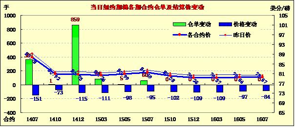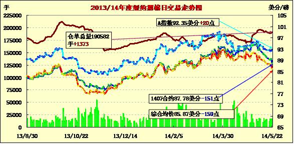 5月22日,紐約期棉遠近合約均大幅下跌;7月合約結算價87.78美分/磅,跌151點;10月合約結算價80.92美分/磅,跌73點;1412月合約收于80.73美分/磅,跌115點。受美棉出口周報數(shù)據(jù)利好拉動,期棉開盤上漲近百點,午盤后受市場獲利平倉打壓快速下跌,主力7月合約跌幅明顯;外部商品大豆上漲。上周美國凈簽約出口本年度陸地棉81261噸,裝運43091噸;其中中國凈簽約61076噸,裝運8165噸。美國德州西部棉區(qū)出現(xiàn)降雨,對12月新花合約價格造成影響。