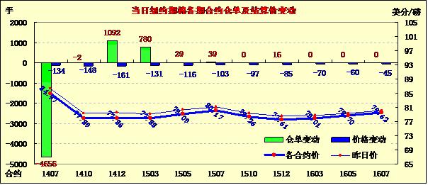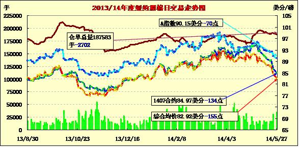 5月27日,在休市三日后,受投機(jī)性賣盤打壓,紐約期棉遠(yuǎn)近合約延續(xù)下跌走勢,跌幅均超百點(diǎn);7月合約結(jié)算價(jià)84.97美分/磅,跌134點(diǎn);1410月合約收于77.89美分/磅,跌148點(diǎn);1412月合約收于77.86美分/磅,跌161點(diǎn)。當(dāng)日期棉開盤后延續(xù)上周五走勢持續(xù)下跌,最低跌至84.85美分/磅,震蕩區(qū)間113點(diǎn);外部商品市場大部分期貨下跌,美元指數(shù)大漲。