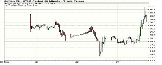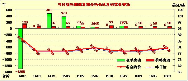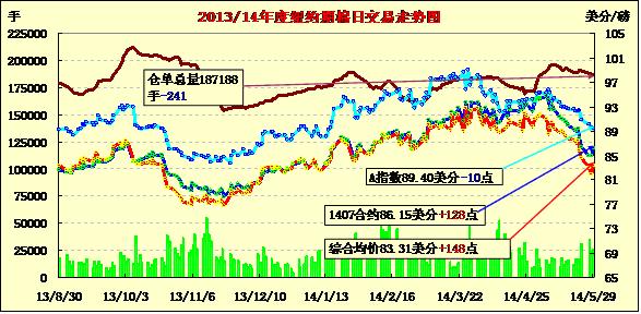 5月29日,受市場投資者買盤拉動,紐約期棉止跌反彈,遠(yuǎn)近合約普遍上漲;7月合約結(jié)算價86.15美分/磅,漲128點(diǎn);1410月合約收于78.32美分/磅,漲65點(diǎn);1412月合約收于78.38美分/磅,漲66點(diǎn)。當(dāng)日期棉開盤后普遍上漲,此前四連跌累計(jì)下跌442點(diǎn),午盤后主力合約漲勢明顯,達(dá)到86.94美分/磅高點(diǎn),7/12月合約價差777點(diǎn)。預(yù)計(jì)美棉供應(yīng)量在年底前仍將持續(xù)吃緊,關(guān)注今晚發(fā)布的美棉出口周報。