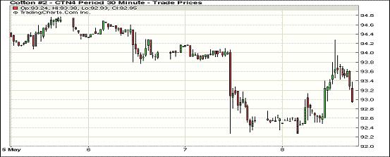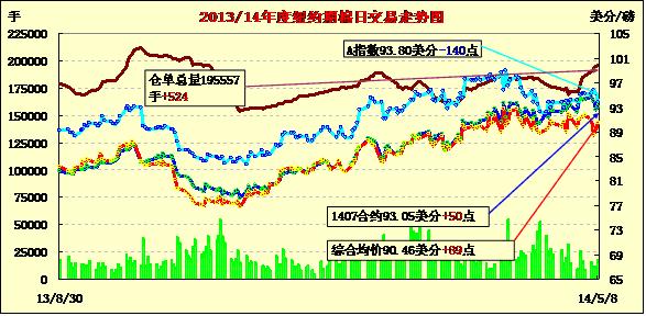 5月8日,紐約期棉除主力月合約上漲外,其他遠(yuǎn)期合約均持續(xù)下跌。7月合約收于93.05美分/磅,漲50點(diǎn);10月合約結(jié)算價(jià)84.44美分/磅,跌36點(diǎn);1412月合約收于83.51美分/磅,跌40點(diǎn)。當(dāng)日主力7月合約開盤后結(jié)束兩連跌反彈上漲,午后受美棉出口數(shù)據(jù)利好支持再度走高,最高漲至94.27美分/磅,盤終回吐部分漲幅收于93美分以上;玉米和大豆等商品市場(chǎng)指數(shù)下跌。