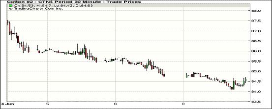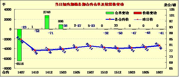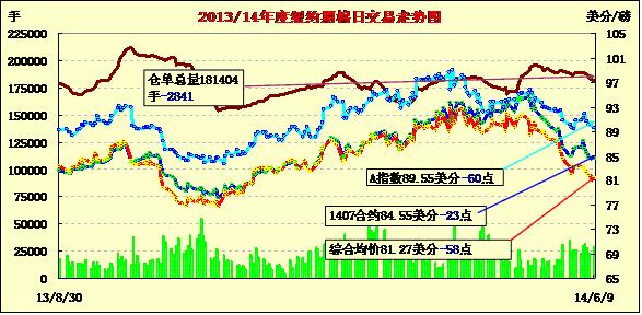 因上周末美國主產棉區(qū)德國迎來利好降雨,6月9日紐約期棉連續(xù)第四個交易日收跌,主力1407月合約結算價84.55美分/磅,跌23點;1410月合約結算價76.98美分/磅,跌52點;1412月合約收于77.29美分/磅,跌71點。當日主力7月合約當日先逆后揚,上半場受天氣因素打壓一路下滑至當日最低點84.07美分/磅,后雖然買盤入市促該合約略有反彈,但盤終仍以陰跌收盤。因上周五基金移倉交易活躍,目前1412月合約持倉量超過1407月合約,兩合約價差726點,較上周五的678點走寬48點。