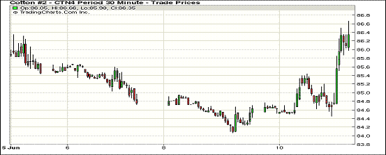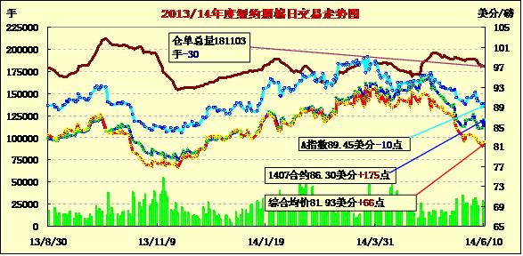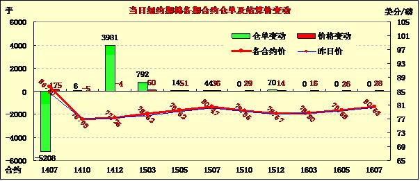 當日主力1407月合約結(jié)算價86.30美分/磅,漲175點;1410月合約結(jié)算價76.93美分/磅,跌5點;1412月合約收于77.25美分/磅,跌4點。當日主力7月合約上半場圍繞85美分/磅上下波動,下半場在市場炒作美棉短期供應偏緊支持下大幅上揚,盤終收漲百余點。7/12月合約價差905點,較前一日走寬179點。當日期棉成交量達5.6萬手,為4月10日以來最高值。