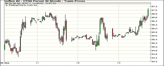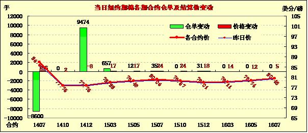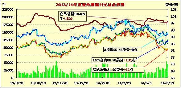 6月13日,紐約期棉除主力1412月合約外普遍收漲,近期1407月合約結(jié)算價(jià)86.98美分/磅,漲136點(diǎn);1410月合約結(jié)算價(jià)77.75美分/磅,漲2點(diǎn);主力1412月合約收于77.75美分/磅,跌8點(diǎn)。當(dāng)日近期7月合約平開(kāi)高走,上半場(chǎng)在85.8美分/磅一線波動(dòng),下半場(chǎng)受買盤(pán)支持一路上揚(yáng),盤(pán)終收于6月3日以來(lái)最高值。本周1407月合約累計(jì)漲220點(diǎn),1412月合約累計(jì)跌25點(diǎn)。