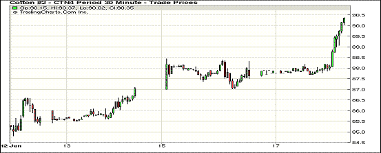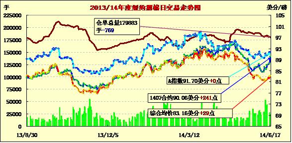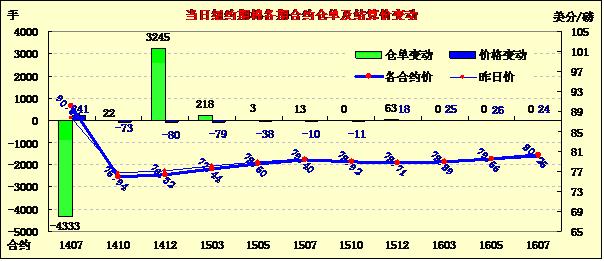 6月17日,紐約期棉漲跌互現(xiàn),主力1412月合約結(jié)算價76.32美分/磅,跌80點(diǎn);1410月合約結(jié)算價75.94美分/磅,跌73點(diǎn);近期1407月合約收于90.06美分/磅,漲241點(diǎn)。當(dāng)日1407月合約平穩(wěn)開盤后大部分時段平穩(wěn)在88美分/磅一線,交易后半場買盤入市促該合約急速上揚(yáng),盤終收于5月15日以來最高值。德州利好天氣打壓1412月合約三連跌,當(dāng)日收于2013年11月以來最低值。因預(yù)報稱美國最大產(chǎn)棉區(qū)德州將迎來更多利好降雨,市場對新年度美棉增產(chǎn)的預(yù)期升溫對1412月合約形成打壓;當(dāng)日1407月合約大漲,很可能是將有大量合約交割的證據(jù),這鞏固了對近月棉花供應(yīng)緊張的擔(dān)憂。