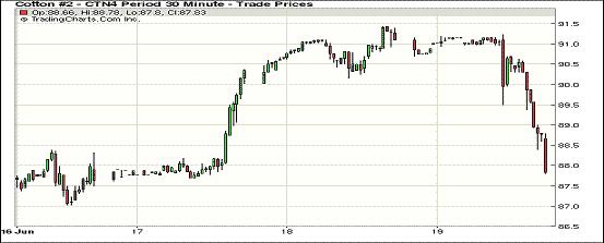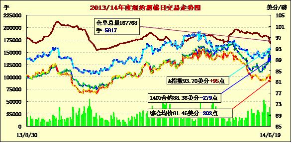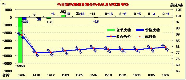 因新一期出口周報(bào)顯示美棉2014/15年度棉花銷售乏善足陳,抵消了當(dāng)前年度棉花銷售強(qiáng)勁,且交易商結(jié)清7月合約頭寸也拖累市場,6月19日紐約期棉未能延續(xù)前一日漲勢全面下滑,主力1412月合約結(jié)算價(jià)77.13美分/磅,跌6點(diǎn);1410月合約結(jié)算價(jià)76.81美分/磅,跌39點(diǎn);近期1407月合約收于88.36美分/磅,跌279點(diǎn)。1407月棉花合約下周進(jìn)入交割通知期(7月9日到期),交易商紛紛在合約到期前結(jié)清頭寸拖累該合約大幅下跌,盤中下挫超過3美分,盤終較前一日收低3.1%。12月合約當(dāng)日運(yùn)行較為平穩(wěn),盤終略有回落。當(dāng)日外部谷物及原油市場收漲。新一期美棉出口周報(bào)顯示,盡管當(dāng)前2013/14銷售年度棉花銷售優(yōu)于市場預(yù)期,但2014/15作物年度棉花銷售令人失望。