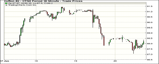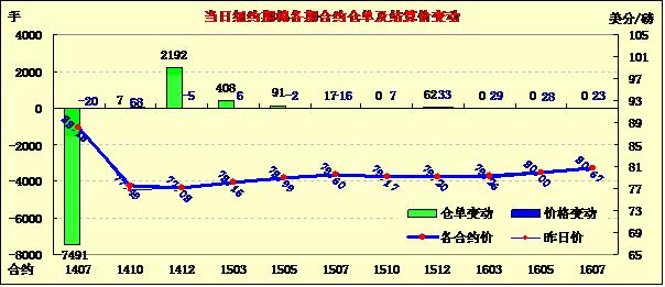 6月20日紐約期棉漲跌互現(xiàn),主力1412月合約結算價77.08美分/磅,跌5點;1410月合約結算價77.49美分/磅,漲68點;近期1407月合約收于88.16美分/磅,跌20點。當日1407月棉花合約即將進入交割通知期(7月9日到期),投資者紛紛結清頭寸打壓該合約連續(xù)數(shù)日走低。本周1407月合約累計漲118點;1412月合約跌67點,該合約連續(xù)第二周收跌。7/12月合約價差本周擴大185點至1108點。