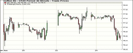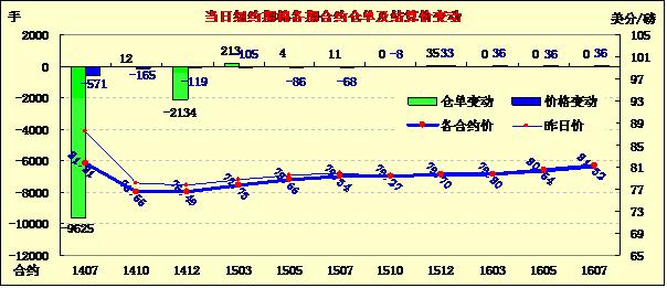 6月24日紐約期棉全面大幅收跌,主力1412月合約結(jié)算價76.49美分/磅,跌119點;1410月合約結(jié)算價76.55美分/磅,跌165點;近期1407月合約收于81.81美分/磅,跌571點。當(dāng)日1407月合約進(jìn)入第一交割通知日,當(dāng)日發(fā)出101張交割通知單。市場傳言稱,一持有大規(guī)模多頭頭寸的投資者因客戶取消一大宗訂單而被迫賣出,導(dǎo)致該合約盤中急跌7.1%,因進(jìn)入交割期不受漲跌幅限制,該合約收跌近600點,創(chuàng)下現(xiàn)貨合約自2011年7月初以來的最大單日跌幅。