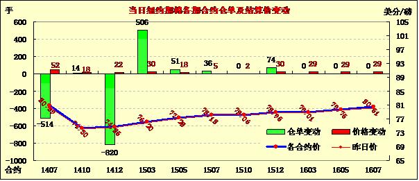 當日主力合約開盤后短暫徘徊在74.4美分/磅一線,后買盤入市促該合約上揚,下半場基本圍繞74.8美分波動,盤終小幅收漲。本周1412月合約累計跌223點,跌幅2.3%,為連續(xù)第三周下滑;1407月合約累計跌727點,跌幅8.2%。