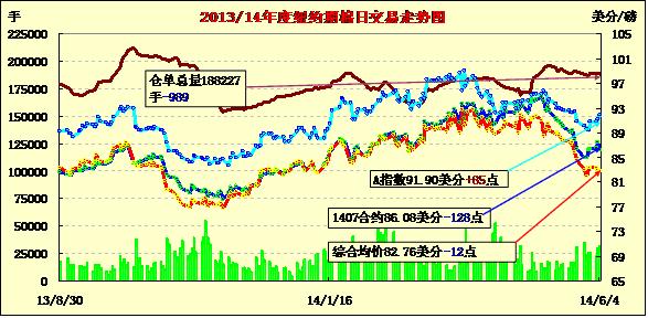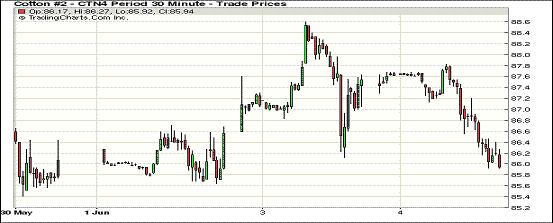 6月4日,因預報稱美國最大產(chǎn)棉區(qū)德州將迎來利好降雨,同時市場擔憂USDA將于今晚公布的美棉周度出口數(shù)據(jù),紐約期棉結束過去四個交易日連續(xù)上漲的局面掉頭收跌,主力1407月合約結算價86.08美分/磅,跌128點;1412月合約收于77.88美分/磅,跌27點。當日期棉略有高開,主力7月合約上半場圍繞87.4美分/磅震蕩;午盤后利空消息主導市場,該合約一路下滑至盤終,錄得一周來最大單日跌幅,且抹去了過去四日的半數(shù)漲幅。當日外部大豆及小麥市場收漲,玉米及原油期貨走低。
