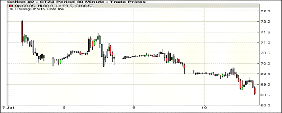 7月10日,紐約期棉再度大幅下跌,主力合約再創(chuàng)新低;10月合約結(jié)算價(jià)68.90美分/磅,跌165點(diǎn);1412月合約收于68.55美分/磅,跌112點(diǎn)。當(dāng)日期棉低開(kāi)低走,主力12合約在過(guò)去12個(gè)交易日里11日下跌,跌至68.55美分/磅新低;外部谷物市場(chǎng)玉米和大豆下跌,美元指數(shù)下跌。由于市場(chǎng)缺乏投資者買盤,本周期棉延續(xù)近期走勢(shì)連續(xù)下挫,市場(chǎng)關(guān)注今日發(fā)布的USDA產(chǎn)量報(bào)告,市場(chǎng)預(yù)計(jì)棉價(jià)仍有進(jìn)一步下行空間;6.27-7.3一周美國(guó)凈簽約出口本年度陸地棉15331噸,裝運(yùn)30935噸。 當(dāng)周中國(guó)凈簽約本年度陸地棉794噸,裝運(yùn)8323噸。