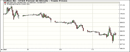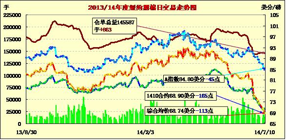 7月11日,受USDA供需報(bào)告利空打壓,紐約期棉延續(xù)近期弱勢(shì)繼續(xù)下跌;10月合約結(jié)算價(jià)68.90美分/磅,跌165點(diǎn);主力12月合約68.55美分/磅,跌112點(diǎn)。當(dāng)日期棉開盤后略有上漲,后受到USDA月報(bào)大幅調(diào)增2014/15年度美棉產(chǎn)量和全球期末庫存打壓掉頭下跌,主力合約再創(chuàng)新低,一度跌破68美分/磅支撐位。USDA報(bào)告預(yù)測(cè)本年度美棉產(chǎn)量由此前預(yù)計(jì)的1500萬包增值1650萬包,期末庫存同樣上升,主力合約一個(gè)月來跌幅超9美分。